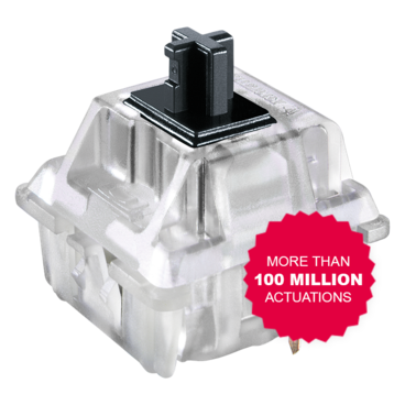 The linear switching characteristic combined with an increased spring force triggers directly. Thanks to a stronger spiral spring, the tried and true CHERRY MX Black smoothly moves the keys back to the starting position and grants the necessary staying power for long writing and gaming sessions.