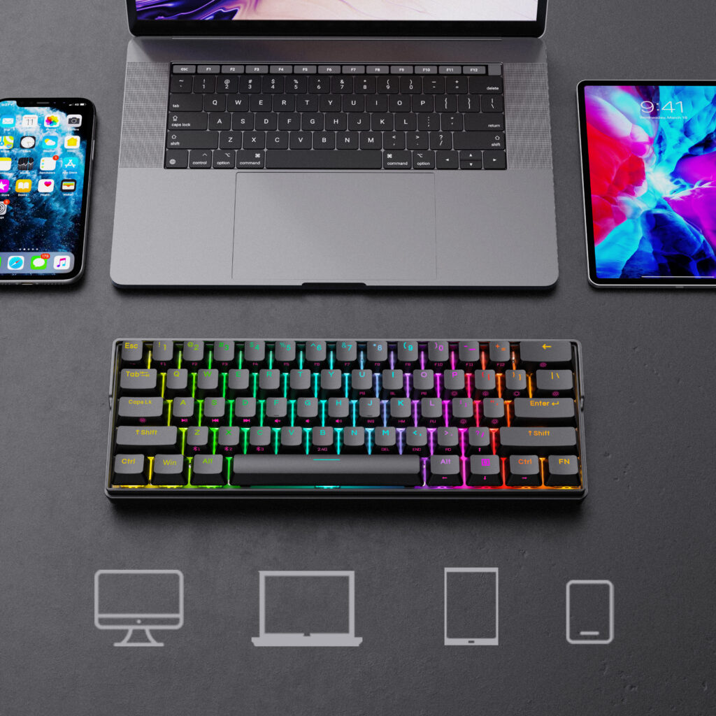 The KEMOVE DK61 has all the most important things on a mechanical keyboard. Good look, plastic case but robust and good enough feel, switches brands and many switches colors to choose and hot swappable, PBT keycaps double shot, lateral serigraphy for function keys, RGB leds with many effects and intensity, detachable and reversible USB cable on both sides, cable connection and wireless conection with a big battery capacity for a up to three devices configured and easily change between them, dust cover included on the package. All this for a affordable price that makes this 60% keyboard one of the best recomendations on this price range and on more expensive ranges.